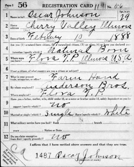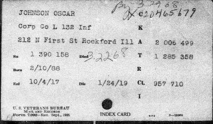 Company L Muster Roll Nov-Dec 1917 Camp Logan, Houston Tx: Enlisted 4 Oct 1917. Listed as Private. Transferred from Company H 342 INF to 33rd DIV per SO#57 Hdq 86th DIV dtd 29 Oct 1917; Assigned to and joined Co L, 132nd INF on 1 Nov 1917 per SO#60 Hdq 33rd DIV dtd 5 Nov 1917. - Muster Roll Jan-Feb 1918 Camp Logan, Houston Tx: Listed as Corporal. Promoted to Corporal per RSO#4 dtd 8 Jan 1918. Promoted to Private First Class per O#6 dtd 1 Jan 1918. - Muster Roll Mar-Apr 1918 Camp Logan, Houston Tx: Listed as Corporal. - Muster Roll May-June 1918 A.E.F.: Listed as Corporal. - Muster Roll July 1918 A.E.F.: Listed as Corporal. - Muster Roll Aug 1918 A.E.F. France: Listed as Corporal. - Muster Roll Sep 1918 A.E.F. France: Listed as Corporal. - Muster Roll Oct 1918 A.E.F. France: Listed as Corporal. Sick-in-Hospital. - Company Roster November 1918 A.E.F.: Listed as Corporal. Dropped Nov 3rd.
