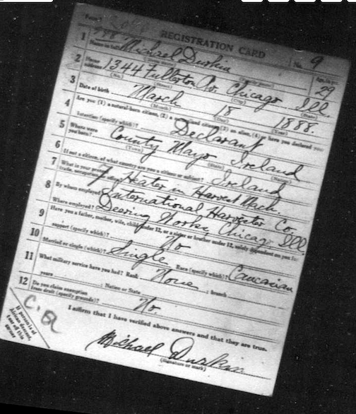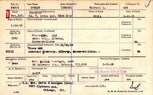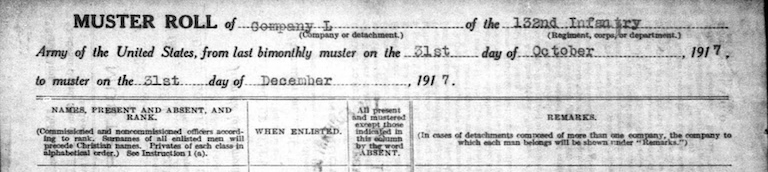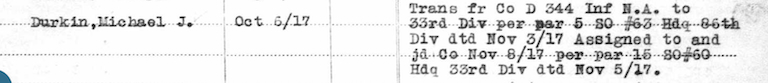 Company L Muster Roll Nov-Dec 1917 Camp Logan, Houston Tx: Enlisted 4 Aug 1917. Listed as Private. Transferred from Company D 344th Infantry to 33rd DIv per SO#66 Hd 86th DIV; Assigned to and Joined Company L, 132nd on 8 Nov 1917 per SO#60 Hdq 33rd DIv dtd 5 Nov 1917.