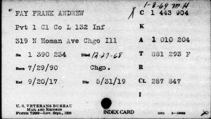 Company L Muster Roll Nov-Dec 1917 Camp Logan, Houston Tx: Enlisted 20 Sep 1917. Listed as Private. Transferred from Company F 343rd INF to 33rd DIV per tel inst War Dept 10 Oct 1917; Assigned to and Joined Company L, 132nd on 5 Nov 1917 per SO#60 Hdq 33rd DIv dtd 5 Nov 1917. - Muster Roll Jan-Feb 1918 Camp Logan, Houston Tx: Listed as Private. - Muster Roll Mar-Apr 1918 Camp Logan, Houston Tx: Listed as Private. - Muster Roll May-June 1918 A.E.F.: Listed as Private First Class. - Muster Roll July 1918 A.E.F.: Listed as Private. - Muster Roll Aug 1918 A.E.F. France: Listed as Private. Listed A.W.O.L. - Muster Roll Sep 1918 A.E.F. France: Listed as Private First Class. - Muster Roll Oct 1918 A.E.F. France: Listed as Private First Class. Sick-in-Hospital. - Company Roster November 1918 A.E.F.: Listed as Private First Class. Dropped Nov 3rd. - Company Roster January 1919 A.E.F. Gonderange, Luxembourg: Listed as Private First Class. Rejoined 7 Jan 1919. - Company Roster February 1919 A.E.F. Gonderange, Luxembourg: Listed as Private First Class. - Company Roster March 1919 A.E.F. Gonderange, Luxembourg: Listed as Private First Class. Absent with Leave 23 March. - Company Roster April 1919 A.E.F.: Listed as Private First Class. Rejoined 2 April 1919. - Company Roster May 1919 Camp Grant, Illinois.: Discharged 31 May 1919. Listed as Private First Class.