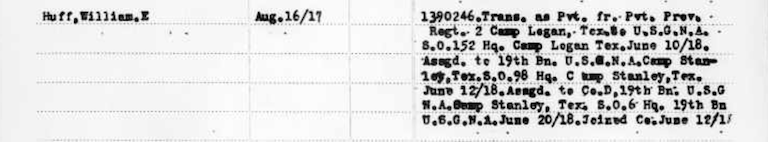 Company L Muster Roll Sep-Oct 1917 Camp Logan, Houston, Tx: Enlisted 16 Aug 1917. Listed as Private. - Muster Roll Nov-Dec 1917 Camp Logan, Houston Tx: Listed as Private. Sick in Base Hospital Camp Logan, Houston, Tx. - Muster Roll Jan-Feb 1918 Camp Logan, Houston Tx: Listed as Private.