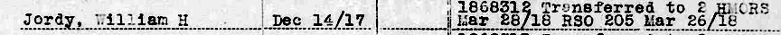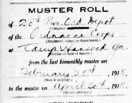 1918 March: Transferred to 2nd HMORS from 20th Provisional Ordance Depot, Camp Hancock, Georgia.
