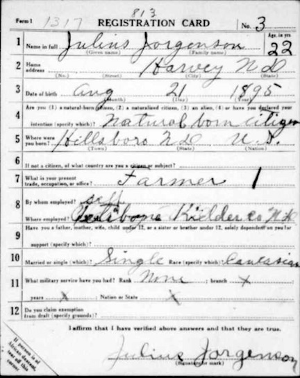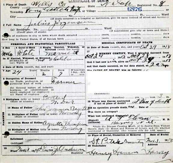 Born Hillsboro, North Dakota on August 21, 1895. Died October 29, 1918 in Wells County, North Dakota. |