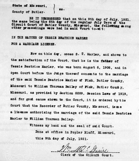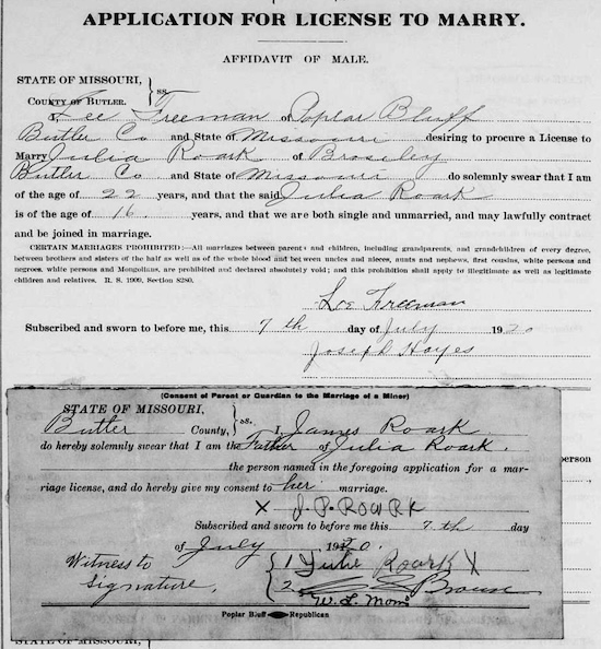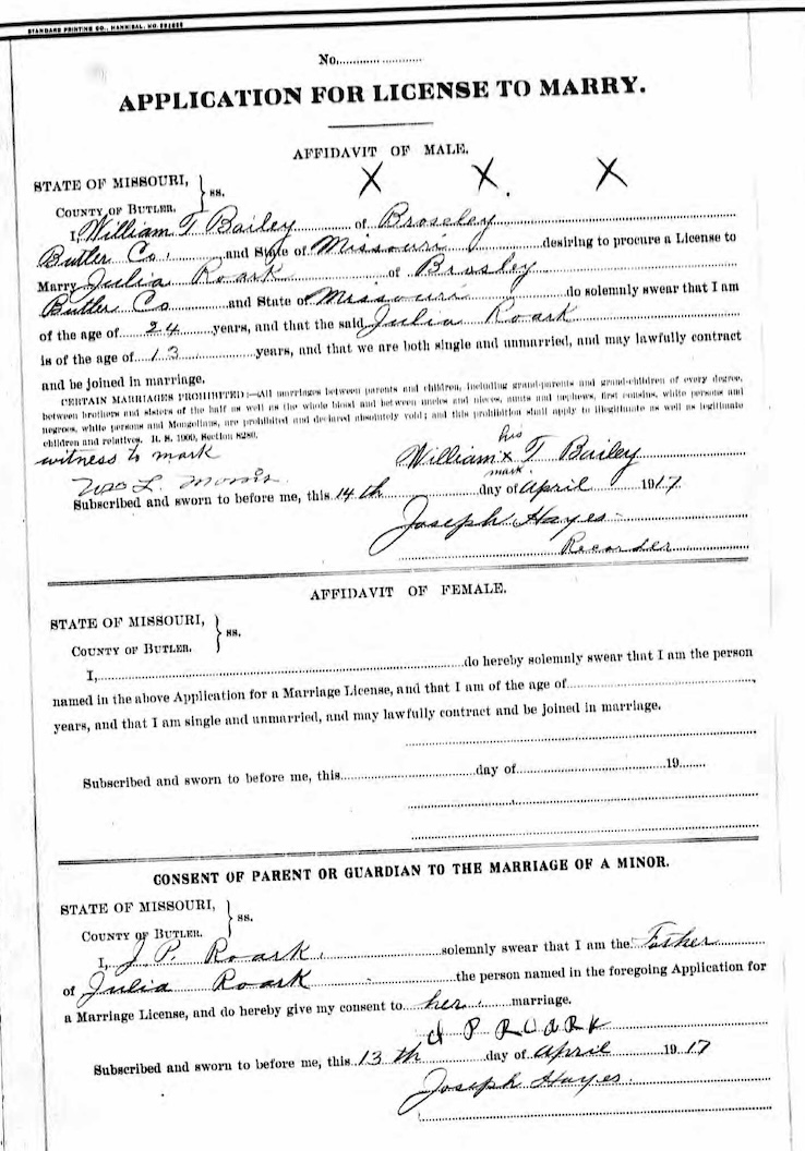 Married, at age 24, in 1917 to Julia ROARK age 13. View Application to Marry. Note: In 1920, Julia, age 16, married Lee FREEMAN. Julia's father gave concent. Assumption is that she deserted Willaim T. View Documentation.