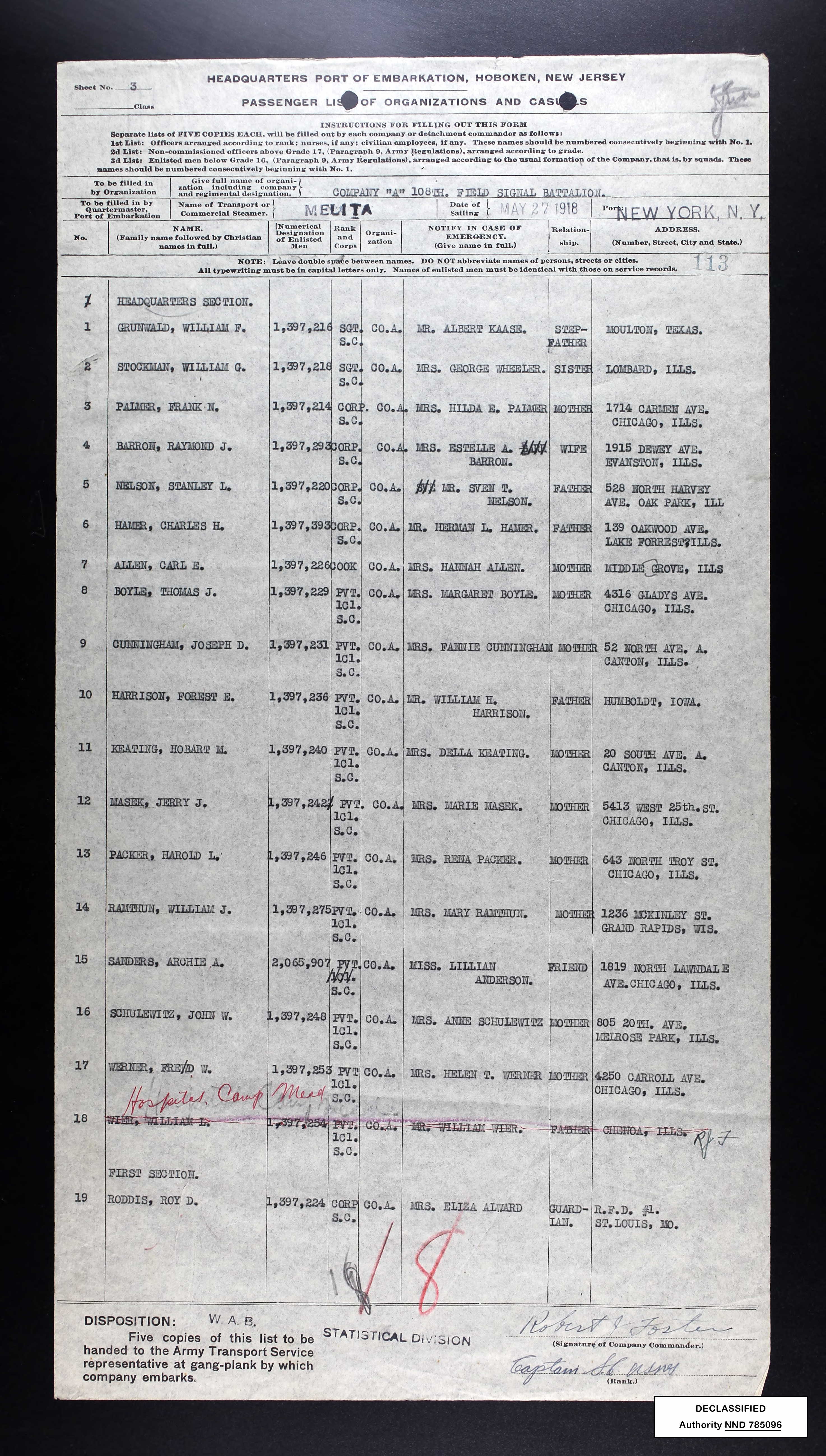 May 27th, 1918: PFC. Headquarters Section, Company A 108th Field Signal Battalion. Enroute from New York to France. Ship: Melita. Manifest page.