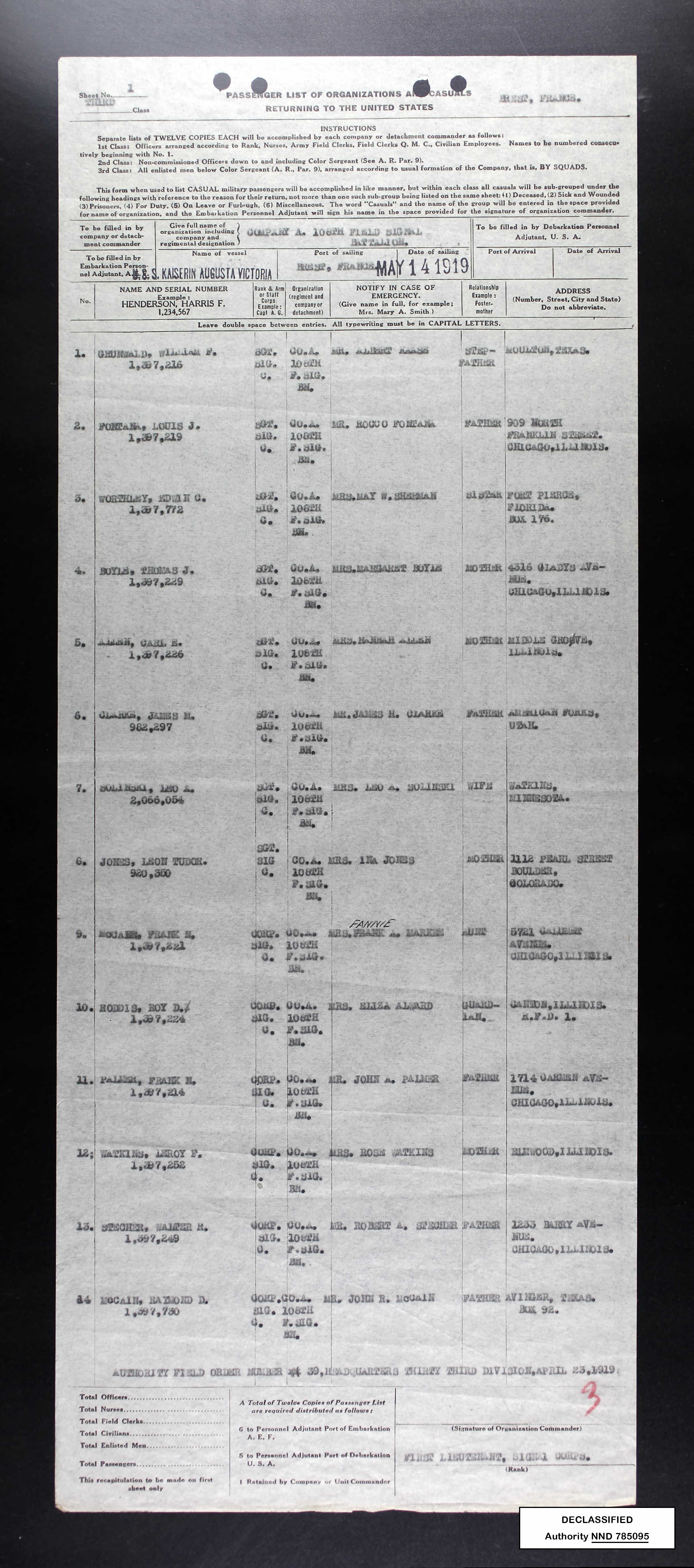 May 14, 1919: SGT. Headquarters Section, Company A 108th Field Signal Battalion. Enroute from Brest, France. Ship: Kaiserine Augusta Victoria. Manifest page.