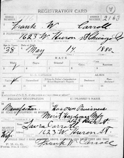 Company L Muster Roll Sep-Oct 1917 Camp Logan, Houston, Tx: Frank W. Enlisted 21 June 1916. Listed as Private First Class - Muster Roll Nov-Dec 1917 Camp Logan, Houston Tx: Frank W. Listed as Private First Class. - Muster Roll Jan-Feb 1918 Camp Logan, Houston Tx: Listed as Private First Class. Discharged thru Base Hospital on CD per 2nd indorsement Hdq 33rd DIV dtd 4 Feb 1918.
