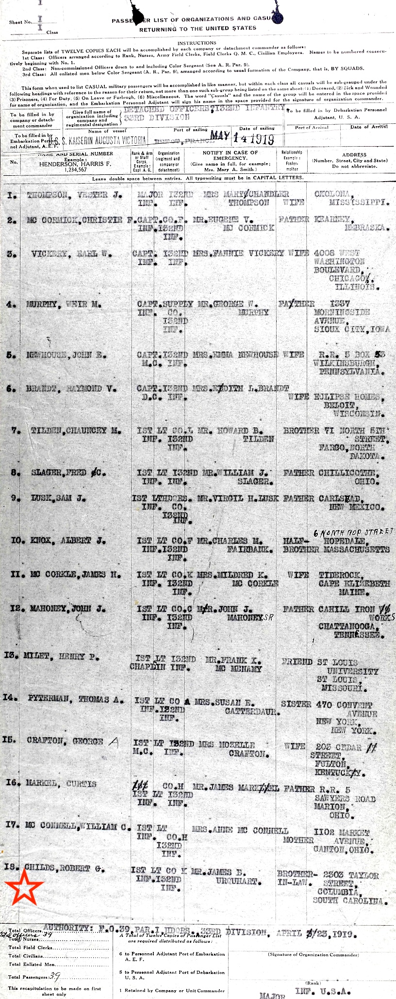 1919 May 14th. Returned to US assigned to Company K, 132nd Infantry, on S.S. Kaaiserin Augusta Victoria sailing from Brest, France.