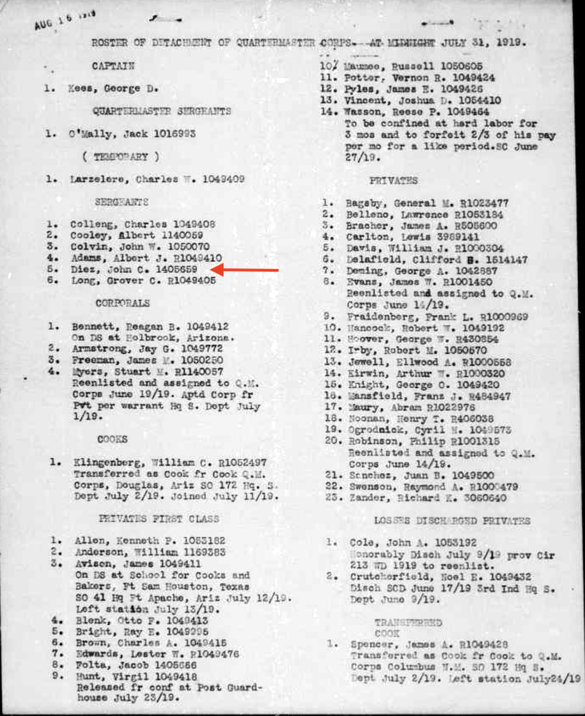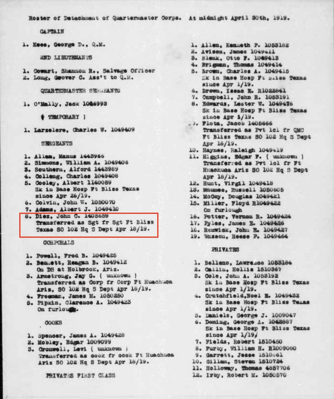 - Muster Roll Jan-Feb 1918 Camp Logan, Houston Tx: Listed as Private First Class. Transferred to Quartermaster Corps National Army (N.A.) per SO#45 dtd 18 Feb 1918.