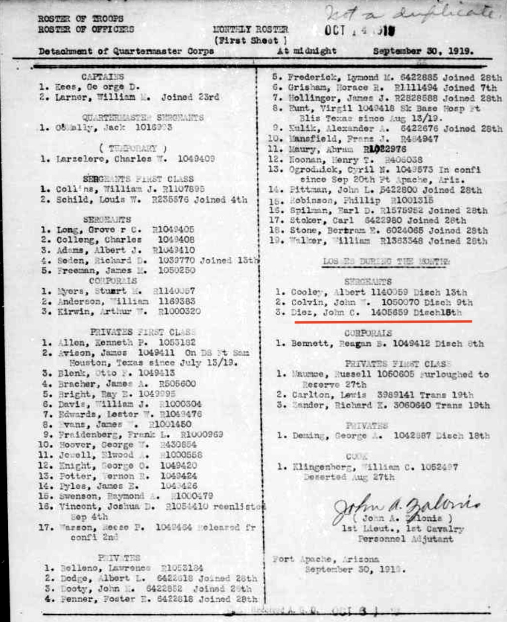 Served with the Quartermaster Corps as a Sergeant until discharged September 15, 1919. Served in Texas and Arizona.