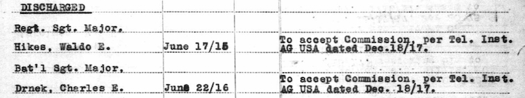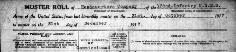- 1917 December 18th: Headquarters Company, 132nd Infantry; Discharged to accept Commission.