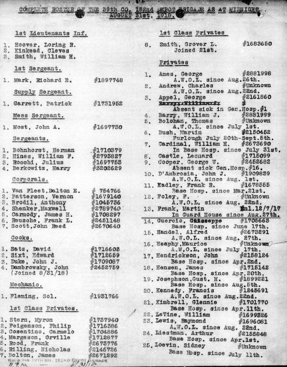August 31, 1918 Roster: Assigned to 39th Company, 150th Depot Bridage.