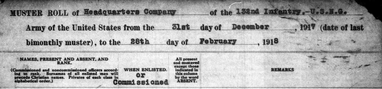1917 October - December: Muster Roll Headquarters Company 132nd Infantry. Listed as Corporal.