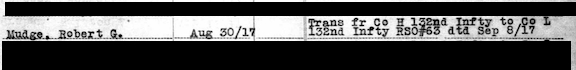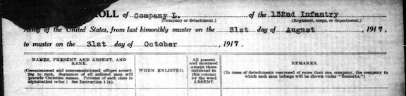 Company L Muster Roll Sep-Oct 1917 Camp Logan, Houston, Tx: Private. Enlisted 30 Aug 1917. Transferred to Company L, 132nd INF from Company H, 132nd INF SO#63 dtd 8 September 1917.