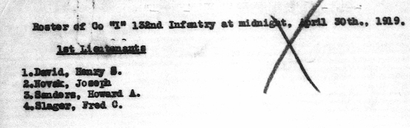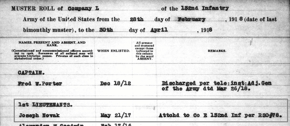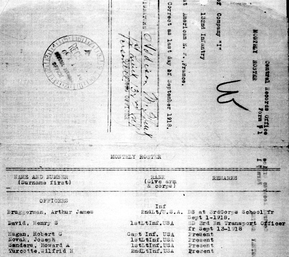- Muster Roll May-June 1918 A.E.F.: TRANSFERRED. Listed as 1st LT; Assigned to Co I on 3 May per RSO#13 dtd 30 Apr 1918.