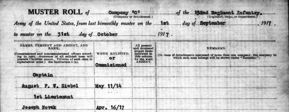 - Muster Roll Mar-Apr 1918 Camp Logan, Houston Tx: Listed as 1st Lieutenant. Attached to Co E 132nd INF per RSO#78.