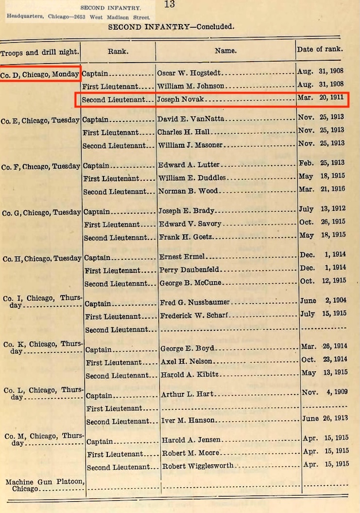 Second Infantry, Illinois National Guard: Second Lieutenant; date of rank: March 20, 1911.