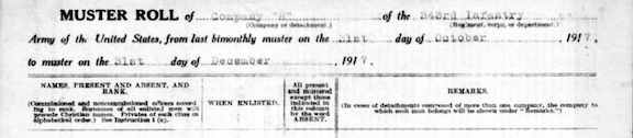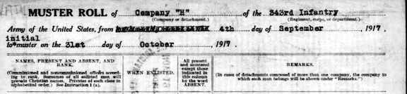 Company L Muster Roll Nov-Dec 1917 Camp Logan, Houston Tx: Enlisted 5 Oct 1917.