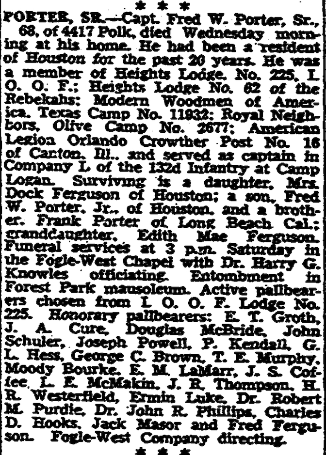 - Company L Muster Roll Nov-Dec 1917 Camp Logan, Houston Tx: Assigned as Commanding Officer on Dec 19, 1917 per SO#117 dtd 19 Dec 1917. - Muster Roll Jan-Feb 1918 Camp Logan, Houston Tx: Special Duty at Capt and 1st Lieut school per Training Cir#20 dtd 6 Feb 1918.