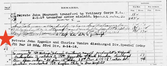 - Muster Roll Jan-Feb 1918 Camp Logan, Houston Tx: Listed as Private. Discharged per SO#35 Hdq 33rd DIV dtd 4 Feb 1918.
